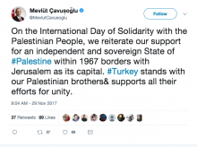 The Turkish foreign minister renewed Wednesday his country's support for an independent and sovereign state of Palestine.