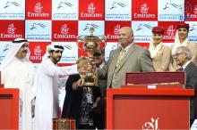 Hamdan bin Mohammed presents Dubai World Cup to owner of winning horse of the world's richest race