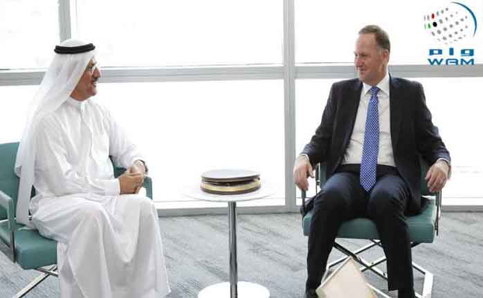 DUBAI, 29th April 2015 (WAM) -- Sultan bin Saeed Al Mansouri, Minister of Economy of the UAE, and John Key, Prime Minister of New Zealand, on Monday met to discuss ways of strengthening bilateral economic and trade cooperation between their two countries. Prime Minister Key hailed the New Zealand-UAE economic partnership and urged for strengthening and promoting it to live up to the economic and trade stature of the two countries. He also emphasised the importance of the UAE as a vital gateway for international trade and re-exports to the Middle East, North Africa and Europe. He also expressed admiration of the progress the UAE is making in all spheres, noting that the country is an oasis of peace and stability in a region being hit by economic and political crisis. Al Mansouri noted that the economies of both countries are open, resilient and attractive for foreign investments. He urged for tapping opportunities in the two countries to encourage their reciprocal investments and joint projects. The minister also noted that the UAE is building a sustainable knowledge-based economy using national human resources. He stressed that the falling oil prices and the current global economic situation will not affect the UAE's economic growth, and that the UAE's economy remained resilient towards the global financial crisis which had affected a number of other economies. Noting that the UAE's economic relations with New Zealand have been growing since 2004, minister Al Mansouri said trade between the two countries grew to unprecedented levels, amounting to more than Dh2.3 billion in 2013. The two parties discussed the need for exchanging information on import licenses and standardising the requirements of importing halal mutton and beef. They also discussed ways to facilitate New Zealand food exports to the UAE and encourage the private sectors of the two countries to enhance cooperation. Al Mansouri noted that the UAE, and Dubai in particular, have become an authority in Islamic economy, including halal industry The talks were attended by Mohammed Ahmed Al Shehhi, Undersecretary for Economic Affairs at the UAE Ministry of Economy; New Zealand minister of trade Timothy Groser; Jeremy Clarke-Watson, New Zealand Ambassador to the UAE, and Clayton Kimpton, New Zealand Consul General in the UAE. – Emirates News Agency, WAM – http://www.wam.ae/en/news/emirates/1395279873726.html