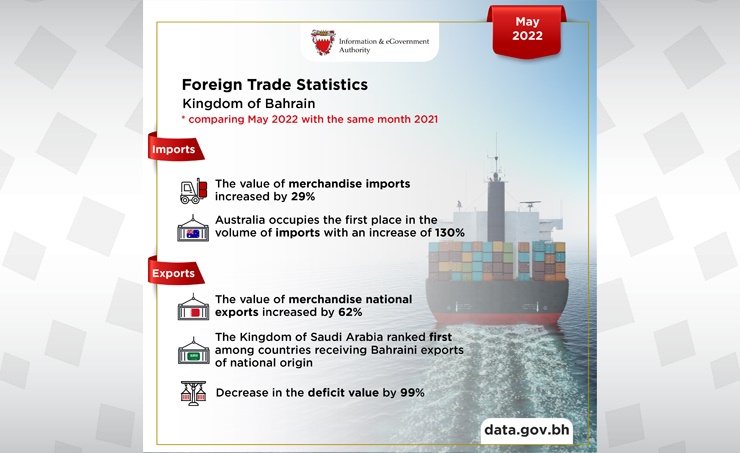 Manama, June 19 (BNA): The Information and e-Government Authority (iGA) issued its foreign trade report of May 2022, encompassing data on the balance of trade, imports, exports (national origin), and re-exports.