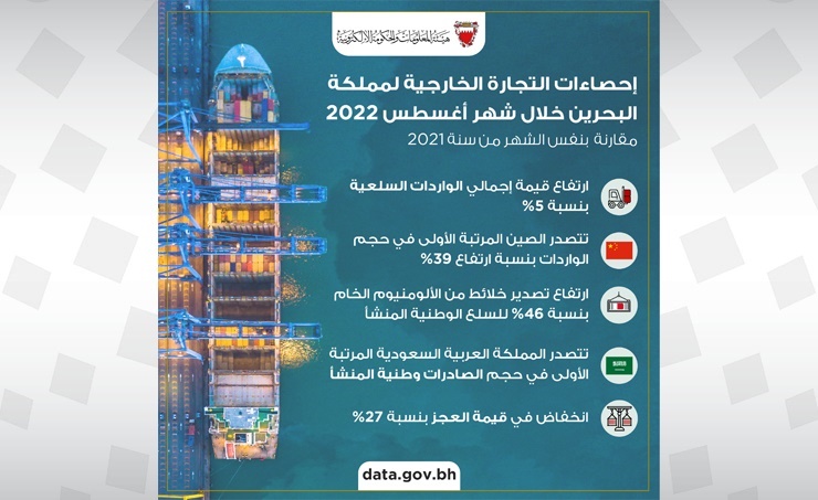 Manama, Sept. 14 (BNA): The Information &eGovernment Authority (iGA) issued its foreign trade report of August 2022, encompassing data on the balance of trade, imports, exports (national origin), and re-exports. The value of imports increased by 5%, reaching BD520 million during August 2022 compared to BD496 million for the same month of the previous year. The top 10 countries accounted for 73% of the value of imports, with the remaining countries accounting for 27%. According to the report, China ranked first when it came to imports to Bahrain, with a total of BD90 million, Australia was second with BD60 million; and the Brazil was third with BD49 million. Aluminum oxide emerged as the top product imported into Bahrain with a total value of BD58 million, while non-agglomerated iron ores and concentrates was second with BD47 million, and parts for aircraft engines third with BD23 million. The value of exports of national origin increased by 8% to BD416 million during August 2022, compared to BD386 million for the same month of the previous year. The top 10 countries in terms of the value of exports of national origin purchased from Bahrain accounted for 81% of the total value, with the remaining countries accounting for 19%. The Kingdom of Saudi Arabia ranked first among countries receiving Bahraini exports of national origin, importing BD88 million from Bahrain. Meanwhile, United States of America was second with BD57 million and Netherlands third with BD43 million. Unwrought aluminum alloys emerged as the top products exported during August 2022 with BD161million, Agglomerated iron ores and concentrates was second with a value of BD58 million and aluminum wire not alloyed third with BD19 million. The total value of re-exports increased by 14% to reach BD65 million during August 2022, compared to BD58 million for the same month of the previous year. The top 10 countries accounted for 83% of the re-exported value, while the remaining countries accounted for the 17%. Kingdom of Saudi Arabia ranked first with BD14 million, The United Arab Emirates second with BD13 million, and Hong Kong third with BD6 million. Vaccines for Human Medicine the top product re-exported from Bahrain with BD9 million, Other wrist watches nonprecious metal came in second place with BD5 million, and Turbo jets of a thrust came third with BD4 million. The trade balance, the difference between exports and imports, recording a decrease in the value of the deficit totaling BD38 million during August 2022 compared to BD53 million for the same month of the previous year, an improvement of the trade balance by 27%. Note: For more details, please visit the foreign trade page on the Bahrain Open Data Portalwww.data.gov.bh.