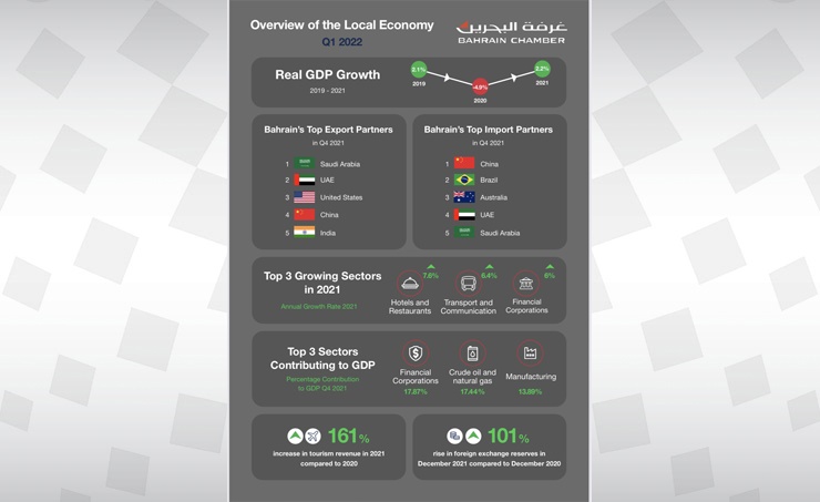 Manama, Apr. 26 (BNA): The Studies and Initiatives Center of the Bahrain Chamber for Commerce and Industry has issued its periodic report for the first quarter of 2022, titled “Overview of the Local Economy- Q1 2022.” The report highlighted the contribution of the economic sectors to the Gross Domestic Product (GDP), statistics on trade exchange, local economic outlook, and the standing of Bahrain globally. It also provides a bird’s eye view on the global economic outlook. Bahrain’s economy has continued its trajectory to recovery as proven by several economic indicators, such the 2.2% growth in the real GDP growth in 2021 , the 11% increase in trade exchange between Bahrain and the GCC countries in 2021 compared to 2020, and the flourish of several economic sector, key among which the tourism sector, scoring a 161% increase in revenues in 2021 compared to 2020. According to the report, the hotels and restaurants, transport and communication, and financial corporations were the top three growing sectors respectively. While the sectors with the largest contribution to the GDP were finance and insurance, followed by crude oil and natural gas, and manufacturing. As for trade exchange partners, China regained its position as Bahrain’s top import partner, with a total value of imports reaching $543 million in Q4 of 2021. On the other hand, Saudi Arabia maintained its position as Bahrain’s top export market in Q4 of 2021, with a total export valued at $602 million. It is worth noting that the complete report is available on the chamber’s official website and mobile application.
