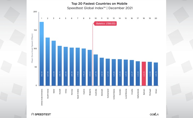 Manama, Feb. 15 (BNA): Batelco demonstrated market leadership in Bahrain with its exceptional mobile network quality by achieving average mobile data download speed of 158Mbps in December 2021, which placed Batelco’s speed in top 10 globally for download speeds available, according to an Ookla Case Study published on its website this week.