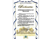 The City of Irvine in California has proclaimed May 28, 2019 as “Azerbaijan National Day” in the city, Trend reports with reference to Azerbaijan’s Consulate General in Los Angeles.