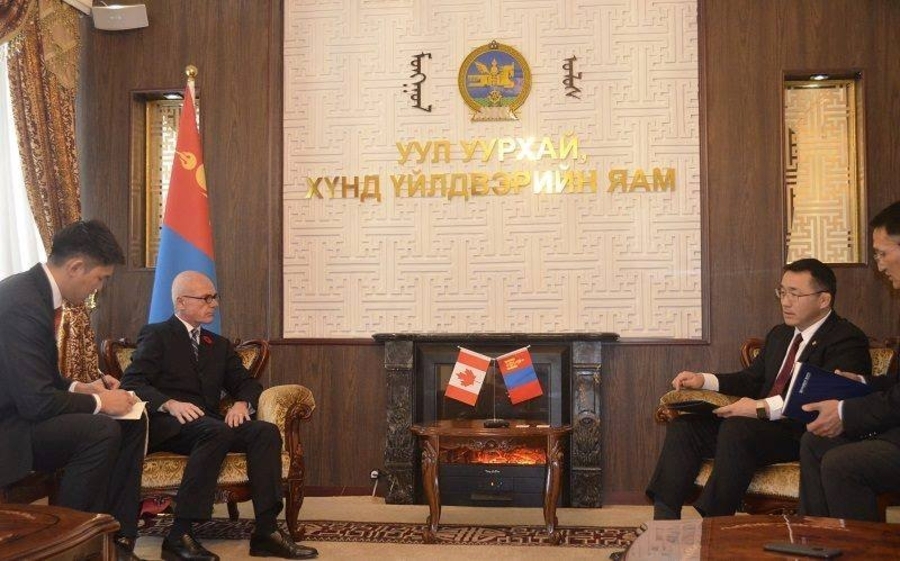 Ulaanbaatar /MONTSAME/ Minister of Mining and Heavy Industry D.Sumiyabazar met David William Sproule, Ambassador Extraordinary and Plenipotentiary of Canada to Mongolia, on November 7. Noting that Canada is one of the biggest investors to the Mongolian mining industry, the Ambassador emphasized Canadian investors are expecting a stability and certainty from Mongolia. The Ambassador pointed out that three projects have been worked out together with the Mongolian Ministry of Mining and Heavy Industry and the Ministry of Environment and Tourism on improving the mining management and doing transparent activities. The Minister underlined the Mongolian Government will always support responsible and transparent companies that contribute to a local development. He said Mongolia will expand the cooperation with Canada and co-implement next projects. "The Government of Mongolia and the Ministry of Mining and Heavy Industry will collaborate with Canada in implementation of projects of the Ivanhoe Mines, Erdene Resource and Centerra Gold," he said. The Minister also expressed Mongolia’s willingness to cooperate with Canada in several directions such as introducing the most up-to-date mining technologies and empowering specialists. B.Batchimeg
