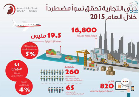 DUBAI, 18th April, 2016 (WAM)--Dubai Trade, the premier cross-border trade facilitator, has revealed substantial growth in the number of companies registered and the value of transactions carried out in 2015. 113,354 companies registered with Dubai Trade, with over 19.5 million transactions during the year, 5% up on 2014.