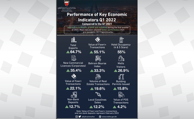 Manama, Apr. 13 (BNA): The Ministry of Finance and National Economy has released a summary of the performance of a number of quarterly economic indicators. Most of the indicators performed better than pre-pandemic 2019 benchmarks. These positive economic signs have arisen following the launch of the Economic Recovery Plan, as well as following a number of initiatives and strategies to develop the economy and create quality job opportunities for citizens. Impressive economic growth was achieved during the first quarter of 2022. In the tourism and hospitality sector, the average hotel occupancy rate in four and five-stars hotels increased by 55% and the number of mall visitors increased by 26.9%. In the commerce sector, new commercial licenses increased by 35.4%, and the value of sales for Bahrain ATM cards increased by 4.2%. In international trade the total value of exports reached 64.7%. In the financial services sector, remarkable growth was achieved in February. Fawri+ transactions grew by 55.1% and Fawri transactions increased by 22.1%. Similarly, total non-bank deposits grew by 12.7% and the Bahrain Bourse index witnessed a 33.3% increase. In the real estate sector, transactions registered with the Survey and Land Registration Bureau increased by 19.6% while the number of building permits increased by 15.8%. Additionally, total fuel sales increased by 12.2%.