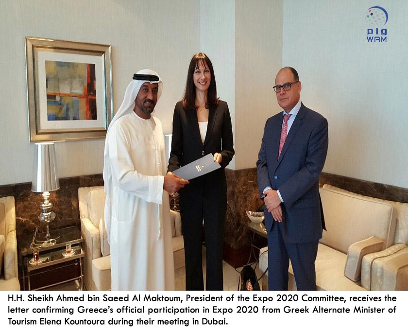 DUBAI, 30th October, 2016 (WAM) -- Greece has become the latest nation to confirm its commitment to participate in Expo 2020 Dubai, building on the strong links between the two countries in various fields Expo 2020 Dubai, announced on Saturday that Greece has confirmed its official participation in Expo 2020 through a letter from the Greek Prime Minister, Alexis Tsipras, addressed to His Highness Sheikh Mohammed bin Rashid Al Maktoum, Vice President and Prime Minister of the UAE and Ruler of Dubai. The letter was delivered to HH Sheikh Ahmed bin Saeed Al Maktoum, President of the Expo 2020 Committee, by Greek Alternate Minister of Tourism Elena Kountoura, who met with Sheikh Ahmed as part of a series of meetings with UAE ministers, including Sultan bin Saeed Al Mansouri, Minister of Economy. Welcoming Greece’s participation in Expo 2020 Dubai, Sheikh Ahmed said: "Dubai’s role as a global hub is widely recognised and it is firmly in the mind of many nations that are looking to make valuable connections, in line with the mega-event’s theme Connecting Minds, Creating the Future’. We are delighted that Greece has become that latest nation to sign up to participate in Expo 2020 Dubai, which will further deepen the relations between our countries." Reem Al Hashimy, UAE Minister of State for International Cooperation, and Director General, Dubai Expo 2020 Bureau, said: "The UAE warmly welcomes Greece’s participation in Expo 2020 Dubai. Greece’s participation is testament to Expo serving as a valuable and innovative platform for all nations, across the three sub-themes of Opportunity, Mobility and Sustainability." Minister Elena Kountoura said: "Expo 2020 Dubai represents an enviable platform for many nations to come together. Greece can particularly relate to the creation of possibilities for the youth of the world to engage and operate in an international collaborative way, in line with the Expo 2020’s subthemes of ‘Opportunity’, ‘Mobility’ and ‘Sustainability’. At their meeting, HH Sheikh Ahmed bin Saeed and Minister Kountoura, discussed the positive results of steps taken already to strengthen the tourism relations between Greece and the United Arab Emirates. They also explored the possible development of additional direct air links between the two countries in light of increased tourist flows. Over the course of six months from October 2020, Expo aims to bring together hundreds of countries and millions of people to celebrate human ingenuity: ‘Connecting Minds; Creating the Future’. Between its opening day on 20 October 2020, and its close on 10 April 2021, Expo expects 25 million visitors, 70 percent of them are expected to come from outside the UAE - the largest proportion of international visitors in Expo history. – Emirates News Agency, WAM - http://www.wam.ae/en/news/emirates/1395301962679.html