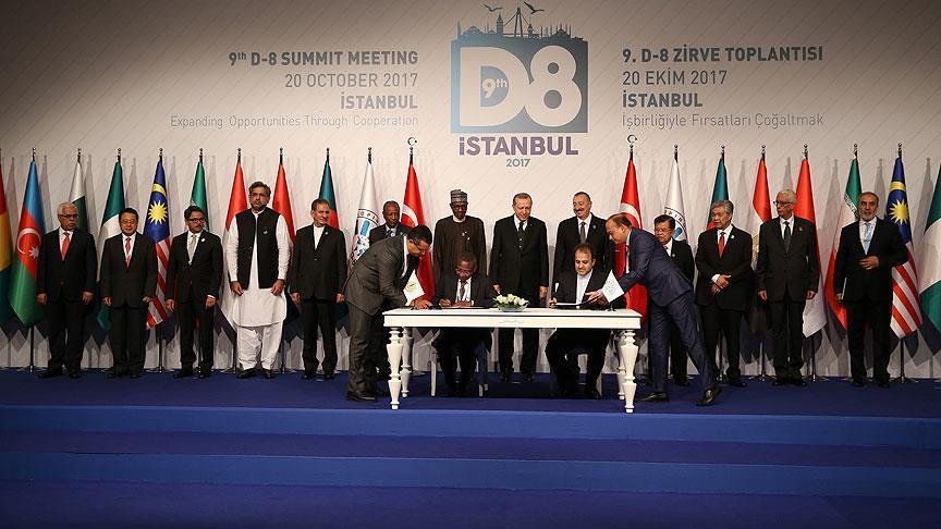 ANKARA The Islamic Development Bank announced Friday that it signed a memorandum of understanding with the D-8 organization to enhance development efforts as well as joint expertise, knowledge and resources for the socio-economic development of Developing 8 countries. "Islamic Development Bank Group will work with The Developing-8 Organization for Economic Cooperation to promote sustained economic growth in the member states of D-8," the bank said in a written statement. Signed during the D-8 Summit in Istanbul, the agreement foresees possible cooperation in identification and implementation of joint programs and projects in the fields of transportation, trade, investment, Islamic finance, energy, industry, small and medium-sized enterprises, agriculture, food security, tourism, science, education and establishment of data banks. It also envisages exchange of knowledge and information on commercial issues. The Islamic Development Bank will also consider allocation of scholarships for students from D-8 states. The D-8 was launched on June 15, 1997, after Turkey's then-prime minister, Necmettin Erbakan proposed the creation of an economic group consisting of eight emerging economies from the Muslim world. Alongside Turkey, Indonesia, Bangladesh, Egypt, Iran, Malaysia, Nigeria and Pakistan created an organization based in Istanbul. Today, it has a combined GDP of $3.7 trillion and includes more than 1 billion people -- around 15 percent of the world’s population.