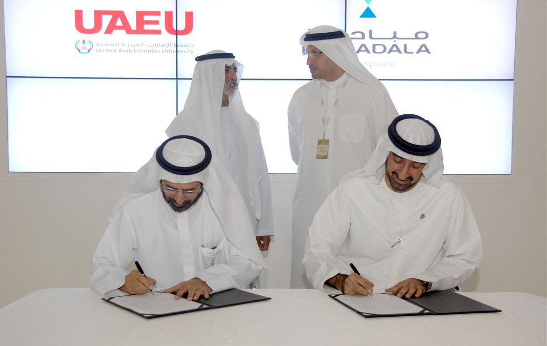 In the presence of Sheikh Nahyan Mubarak Al Nahyan, Minister of Higher Education and Scientific Research and Chancellor of UAEU, and Khaldoon Al Mubarak, Managing Director and CEO of Mubadala Development Company, the agreement was signed by Homaid Al Shemmari, Executive Director of Mubadala Aerospace business unit, and Dr. Ali Rashid Al Noaimi, Vice Chancellor of UAE University during the International Defence Exhibition and Conference (IDEX) hosted at Abu Dhabi National Exhibition Centre (ADNEC).