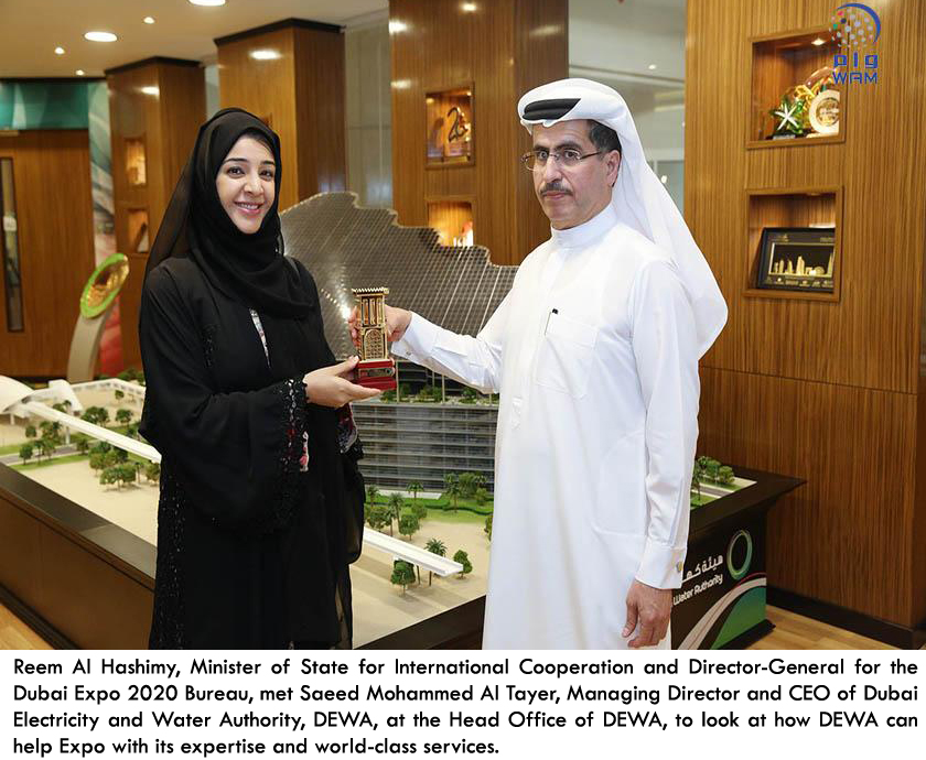 DUBAI, 2nd November, 2016 (WAM) -- Reem Al Hashimy, Minister of State for International Cooperation and Director-General for the Dubai Expo 2020 Bureau, met Saeed Mohammed Al Tayer, Managing Director and CEO of Dubai Electricity and Water Authority (DEWA), at the Head Office of DEWA, to look at how DEWA can help Expo with its expertise and world-class services.