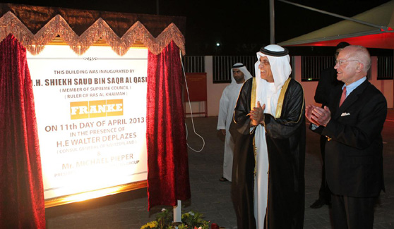 Ras al'Khaimah, April 14, 2013 (WAM) - H. H. Sheikh Saud bin Saqr Al Qasimi, Supreme Council member and Ruler of Ras al-Khaimah, has inaugurated at Ras Al Khaimah Industrial Zone the second Dh 30 million investment project of Franke LLC. ''Ras Al Khaimah and Franke share a common factor: sustainability and the new facility sets a model of environmental awareness and operational and industrial efficiency within Ras Al Khaimah and beyond. Environmental cost will gain increasing significance in doing businesses in decades to come,'' Sheikh Saud said. Sheikh Saud along with Sheikh Ahmed bin Saqr Al Qasimi, Chairman of Ras Al Khaimah Free Zones, Walter Deplazes, Swiss Consul General in Dubai, Michael Pieper, President and CEO of Franke Artemis Group, and heads of local departments, toured the new facility which aims to expand the existing facilities including a new and energy efficient building. The expansion comprises a production site with new technologies, a new logistic center, new training facilities, a new showroom and new offices. The development follows an initial investment of Dh 50m to found Franke LLC in RAK, where Franke Artemis Group - the world's leading provider of intelligent systems for domestic kitchens, professional food service, innovative and customised coffee solutions, beverage systems and intelligent washroom solutions - choose as the ideal destination to aid in ambitions for international expansion into the UAE, KSA, Qatar and Oman. Michael Pieper, President and CEO of Franke Artemis Group, said his group has built the factory in ten months thanks to the huge resources available in Ras Al Khaimah. He added that the new facility is expected to raise the group's sales to Dh 600 million in five years and to over Dh1 bn in the long run. – Emirates News Agency, WAM