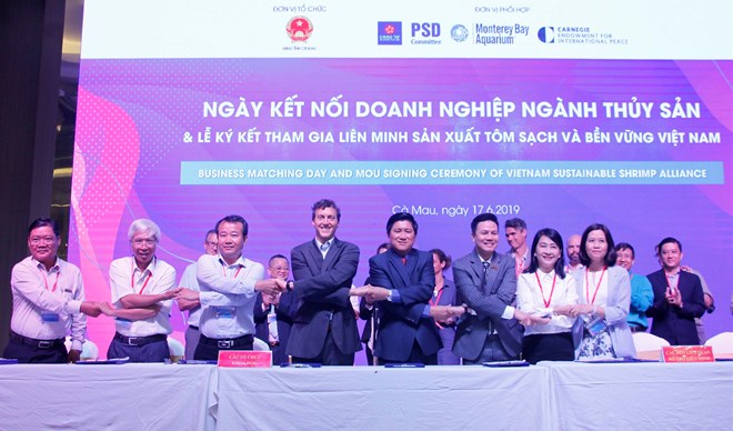 Ca Mau, June 18 (VNA) – An alliance was set up on June 17 with a view to promoting sustainable shrimp production, an important sector in Vietnam’s agriculture. An event to match businesses in the sector and sign a memorandum of understanding on participating in the Vietnam Sustainable Shrimp Alliance (VSSA) was held in Ca Mau, a province in the Mekong Delta – the aquaculture hub of Vietnam. Vice Chairman of the provincial People’s Committee Le Van Su said the VSSA foundation is an inevitable move amidst the fact that Vietnam’s shrimp sector is facing an array of challenges, including seeking markets and meeting consumers’ growing demand for clean and environmentally friendly shrimp products. Josh Madeira, Senior Manager of Ocean Conservation Policy from the US’s Monterey Bay Aquarium Seafood Watch Programme, noted consumers in North America, Europe and Asia consider the taste, freshness, health benefits and food safety as leading criteria when choosing aquatic products. The US, the EU and Japan always have compulsory food safety requirements. Additionally, more than 90 percent of the retailers in North America and 75 percent of those in the EU also request that aquatic products must ensure environmental sustainability, he noted. At the event, major shrimp businesses, farming cooperatives, farming households and agritech firms signed a memorandum of understanding to take part in the VSSA. This will not only help ensure standard farming facilities, food supply and infrastructure but also create a self-contained production chain for the sustainable development of Vietnam’s shrimp sector. In 2018, the industry experienced a year-on-year decline of 7.8 percent in export value to 3.6 billion USD. It aims to record an export revenue of 4.1 – 4.2 billion USD in 2019.-VNA