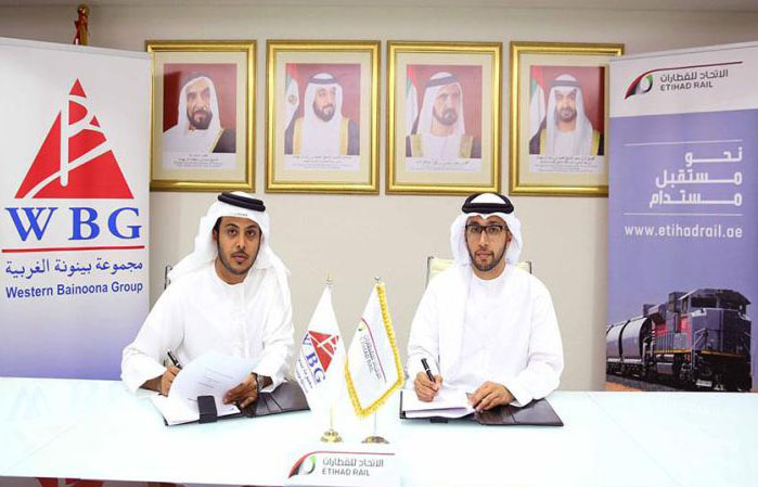 Abu Dhabi (WAM): Etihad Rail , the developer and operator of U.A.E.'s national railway network, has signed a Memorandum of Understanding (MoU) with Western Bainoona Group (WBG). The MoU will enable WBG to use rail for distribution from its crusher location at Tawyeen to the Etihad Rail distribution and export terminals in U.A.E. The approximate annualised transport by rail volume is set to rise to 10,000,000 tonnes by 2020.