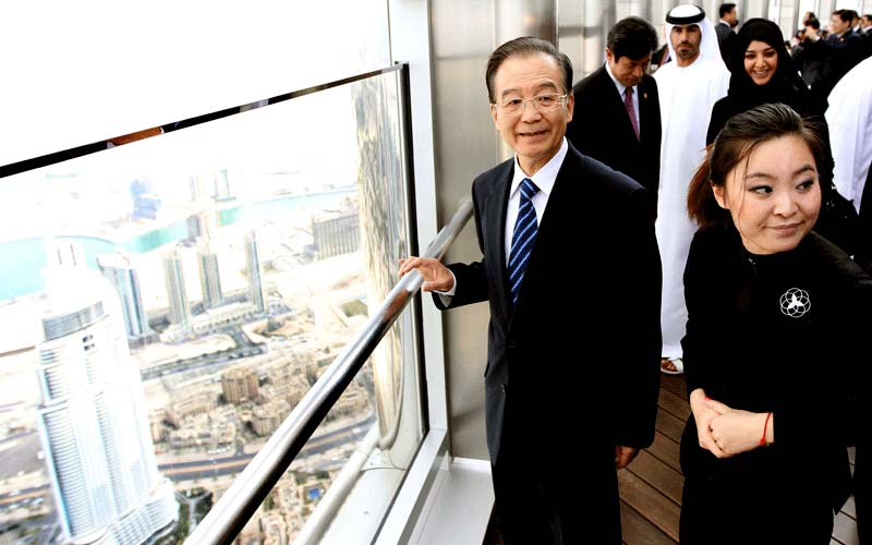 Dubai, Jan 18, 2012 (WAM) - Chinese Premier Wen Jiabao has toured Burj Khalifa and other tourist and business areas in Dubai. He climbed to the 124th floor in Khalifa Burj, where he viewed the landmarks of Dubai City, expressing his admiration about the progress of the UAE in general and Dubai in particular, thanks to the vision of Vice President and Prime Minister and Ruler of Dubai His Highness Sheikh Mohammed bin Rashid Al Maktoum.