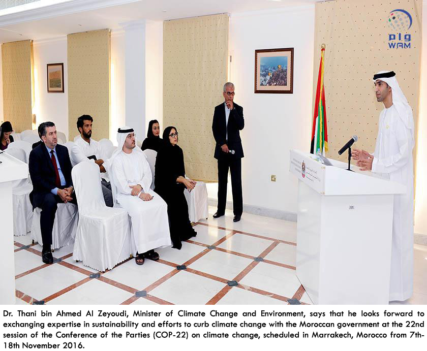 ABU DHABI, 24th October 2016 (WAM)-- The UAE Ministry of Climate Change and Environment seeks to exchange expertise in sustainability and efforts to curb climate change with the Moroccan government and looks forward to highlighting successful Emirati experiences during the 22nd session of the Conference of the Parties (COP-22) on climate change, scheduled in Marrakech, Morocco from 7th-18th November 2016, the Minister, Dr. Thani bin Ahmed Al Zeyoudi, said on Sunday.