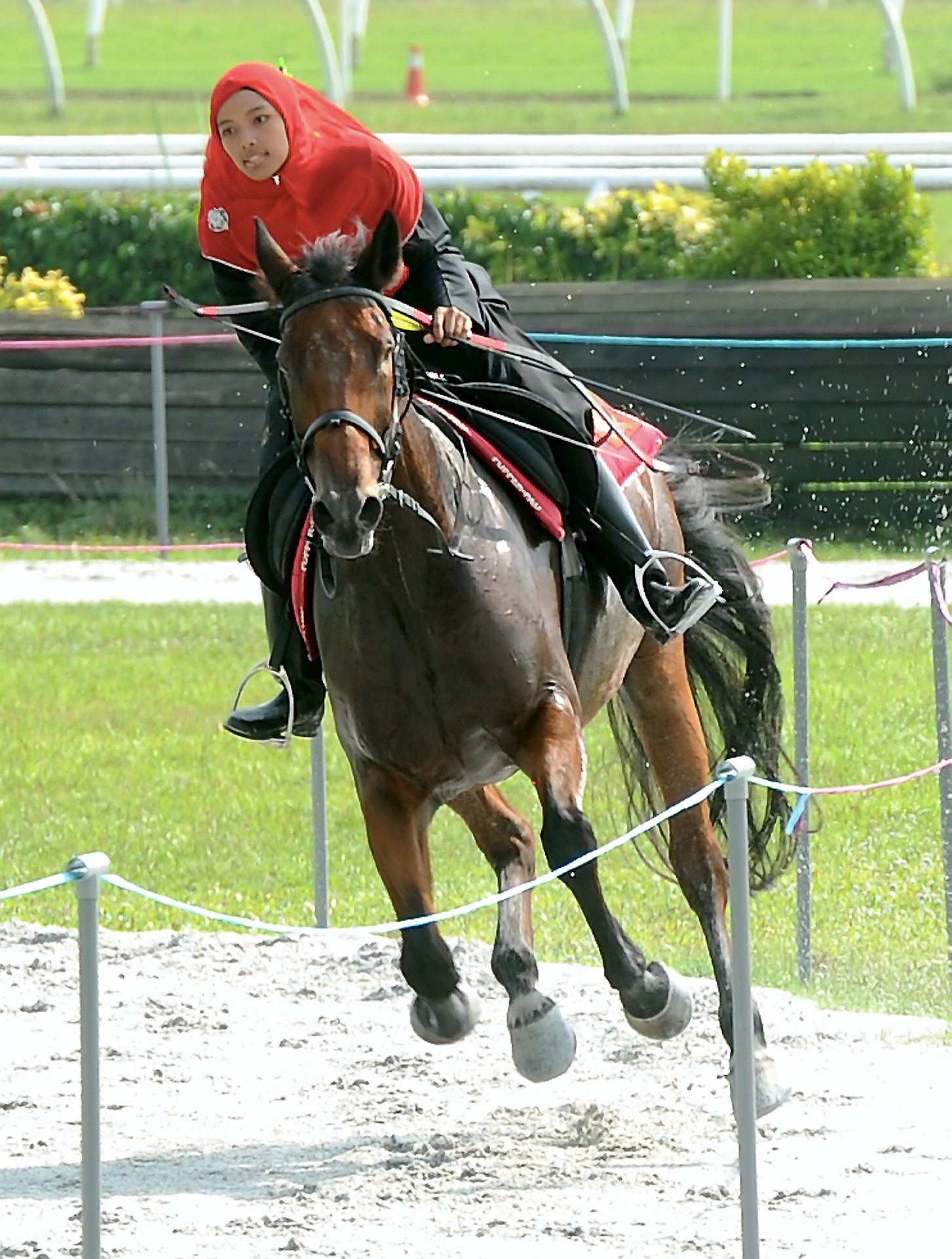 After a two-year hiatus from horseback riding, Erina resumed riding lessons in April this year at the Sungai Besi Air Base, training under Sgt Marshal Ajail, a skilled military horseman.
