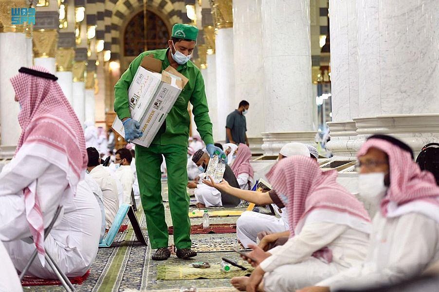 In a statement to the Saudi Press Agency (SPA), the Agency of the General Presidency for the Affairs of the Prophet's Mosque said that the administration on the first night of the last 10 nights of the holy month of Ramadan distributed more than 150,000 bottles of Zamzam water and 2,400 packs of dates at the Prophet's Mosque, adding that 350 employees from the administration took part in the distribution process using 90 bags to carry Zamzam bottles, as well as 15 special carts to distribute the water throughout the Prophet's Mosque.
