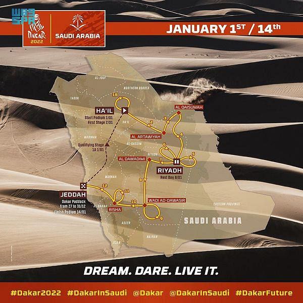 Jeddah, December 13, 2021, SPA -- The third edition of the Dakar Saudi Arabia 2022 has entered the final stages of preparation for the launch of the biggest challenges in the motorsports and the most prestigious rally after 20 days in the desert of the Kingdom of Saudi Arabia, the new homeland for the motorsport. The biggest rally in terms of the number of participants will be held between January 1 and 14, 2022, with the participation of around 1,000 racers from 70 countries, during which participants will go through a challenge of their capabilities to bear the toughest experiences in the motorsports. Racers will have to drive their vehicles in the desert of the Kingdom of Saudi Arabia and its tough terrains for a total distance of about 8,375 kilometers. The Saudi Motorsport Company, the promoting side for the Dakar Saudi Arabia 2022, which works under the umbrella of the Saudi Automobile and Motorcycle Federation and Amaury Sport Organization, had earlier announced the route of the race, which is considered at the same levels of excitement and thrill of the previous two editions. This year’s route will include one prologue stage and 12 ordinary stages that will include one day for rest in Riyadh on January 8. The racers start their journey with a prologue stage from Jeddah to Hail on January 1, with January 2 marking the actual launch of the race from Hail through AlArtawiya, AlQaysumah and Riyadh, then AlDawadimi, Wadi Ad Dawasir, Bisha and Jeddah. The route will also include one marathon stage requiring dealing with the race in a strategic way, high thinking and high physical fitness, where racers will not be able to ask assistance from help vehicles, team members or any helping crews, where all types of external help are considered totally prohibited. --SPA