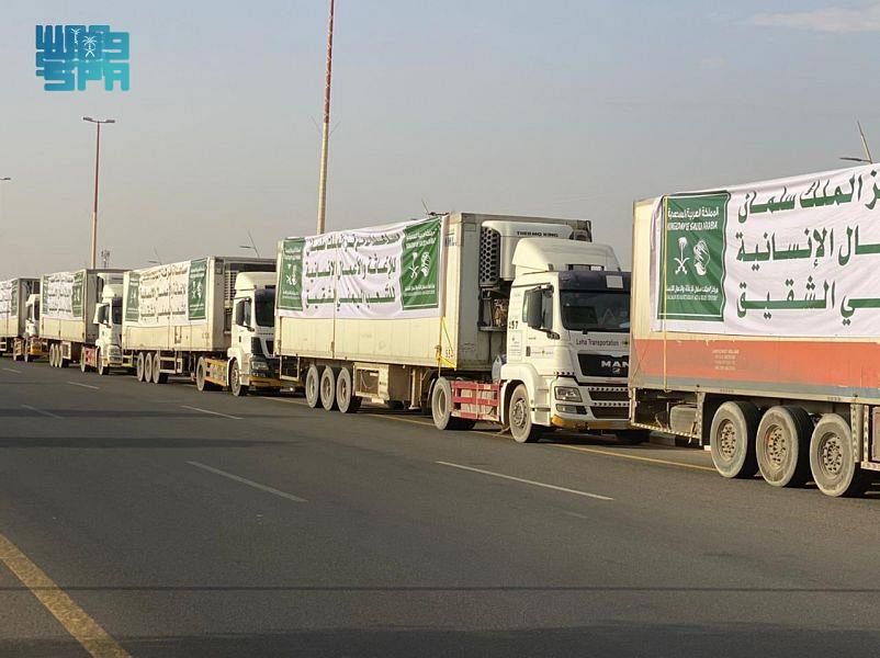 Al-Wadiah Crossing Point, April 23, 2021, SPA -- As many as 26 relief trucks of King Salman Humanitarian Aid and Relief Center (KSrelief) crossed Al-Wadiah Crossing Point, during the period from 21 to 23 April, 2021, carrying 375 tons and 624 kilograms, including 39,195 cartons of dates, 62 tons and 64 kilograms of medical equipment and 800 food baskets for Aden, Marib, Hajjah and Taiz Governorates, Yemen.