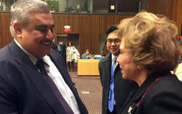 Towards the conclusion of the award launch ceremony Ambassador Mervat Tallawy met Bahrain's Foreign Affairs Minister Shaikh Khalid bin Ahmed Al Khalifa in the presence of Maya Morsy the Chairperson of Egypt's National Council for Women, Morocco's representative in the Organisation's executive board Minister for Women and Family Security and Social Development Baseema El Haqqawi, and Ambassador Layla Bahaa El Deen, to discuss the Arab Group's supporting the work of the Organization.