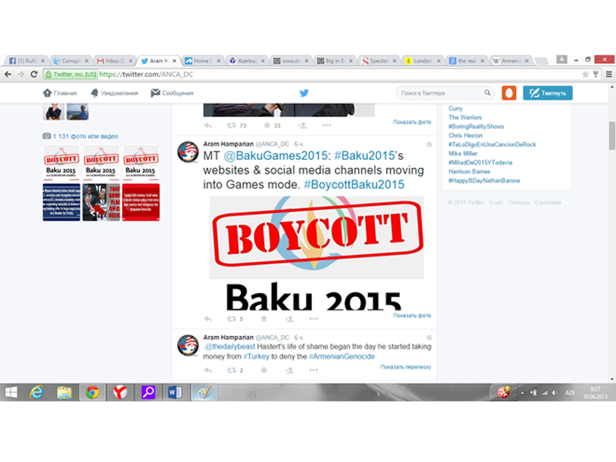 Baku, Azerbaijan, June 10 By Aygun Badalova - Trend: An Armenian organization, working in the US, is charged with a call to boycott the first European Games in Baku. Aram Hamparian, Executive Director of the Armenian National Committee of America, calls for this on his Twitter page. The Armenian National Committee of America (ANCA) is the biggest and most radical Armenian organization in America. This organization has been acting as a financial and ideological source of the Armenian terrorist organization ASALA for a long time. It continues such an activity up till now. The organization has been repeatedly mentioned in money laundering in the US, blackmailing and capturing of various congressmen. Baku 2015 is the first-ever European Games, an exciting and innovative multi-sport event for the continent which will take place on June 12-28, 2015. There will be a total of 20 sports at Baku 2015: 16 Olympic sports and four non-Olympic sports. More than 6,000 athletes from across Europe will be representing their nations over 17 days of competition. Baku was awarded the games by the European Olympic Committees (EOC) in December 2012. --- follow the author on Twitter: @AygunBadalova Follow us on Twitter @TRENDNewsAgency