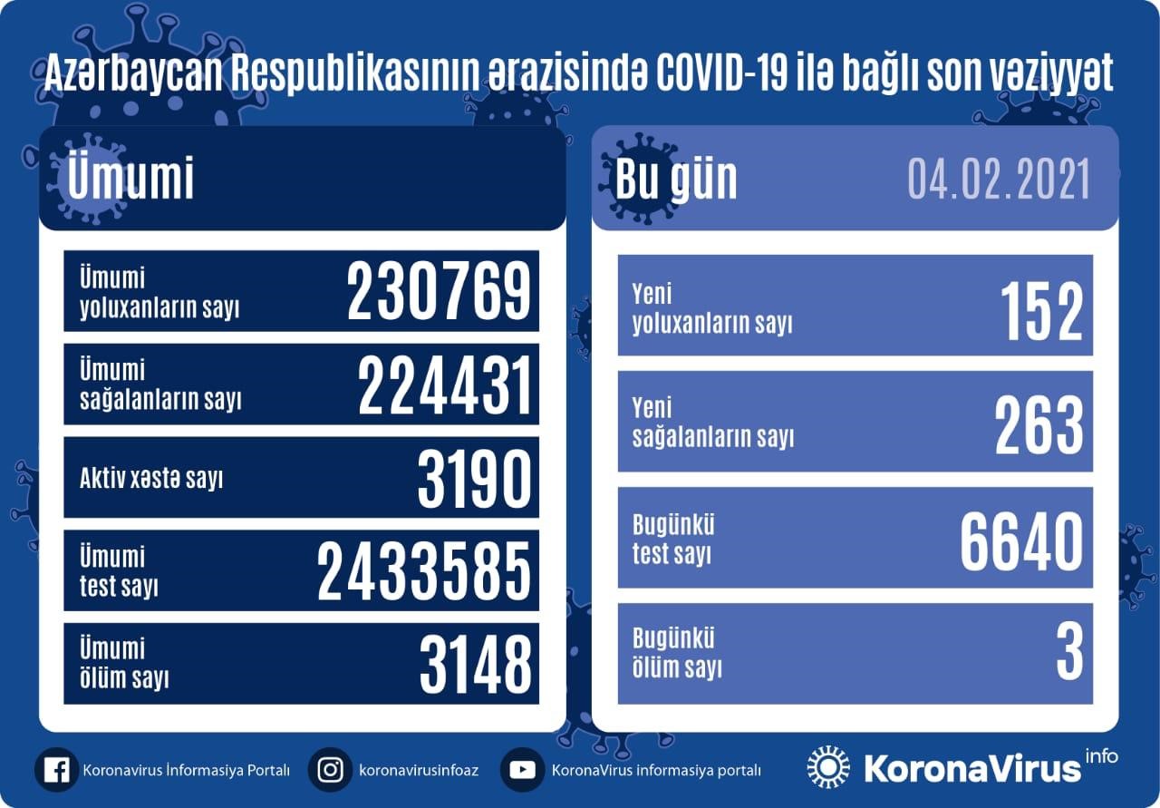 152 new cases of coronavirus infection have been recorded in Azerbaijan, while 263 patients have been recovered, the Task Force under the Cabinet of Ministers told AZERTAC.