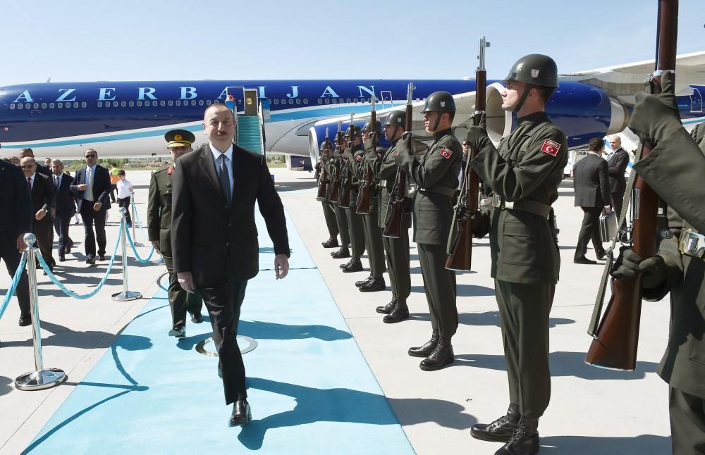A guard of honor was lined up for President Aliyev at the Ankara Esenboga Airport decorated with the national flags of Azerbaijan and Turkey.