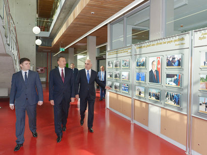 The head of state first reviewed the photo stands in the lobby of the office building, reflecting national leader Heydar Aliyev's participation in the opening of industrial facilities in Azerbaijan both in the Soviet period and in the years of independence.