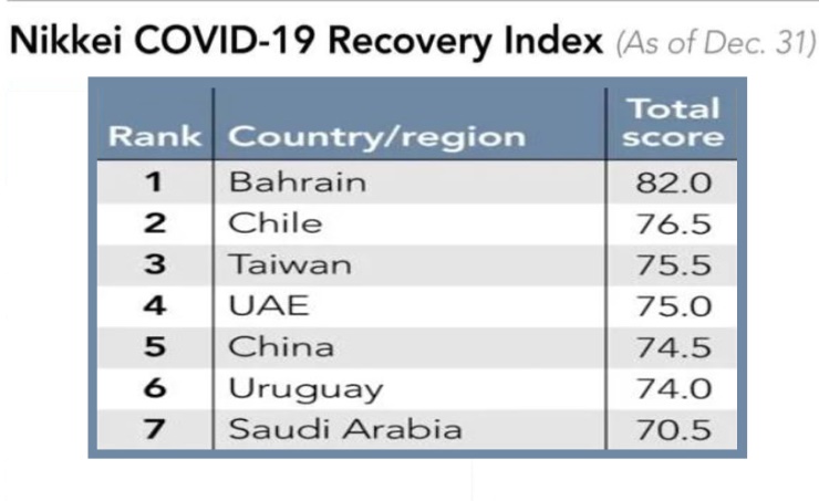 Bahrain achieved 82% for the month of December, the highest score since the Nikkei COVID-19 Recovery Index was launched last year. The record was 76% by China for the month of June 2021 in the first listing.