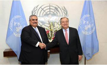 New York, Mar. 16 (BNA): Foreign Affairs Minister Shaikh Khalid bin Ahmed bin Mohammed Al Khalifa has conveyed the greetings of His Majesty King Hamad bin Isa Al Khalifa and those of His Royal Highness Prince Khalifa bin Salman Al Khalifa the Prime Minister, and HRH Prince Salman bin Hamad Al Khalifa, Crown Prince, Deputy Supreme Commander and First Deputy Premier to UN Secretary-General Antonio Guterres, wishing him success in leading the United Nations at this crucial phase.