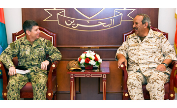 Manama, July 13 (BNA): BDF Commander-in-Chief Field Marshal Shaikh Khalifa bin Ahmed Al Khalifa today received the Commander of the US-NAVCENTCOM/Fifth Fleet Commander Admiral Kevin Donegan. The BDF commander-in-chief welcomed the US commander, praising the increasingly-growing military cooperation; and discussed with him various topics of shared interest. The Director of the BDF General Command Major-General Hassan Mohammed Saad; Inspector-General Major-General Abdullah Hassan Al Nuaimi; Assistant Chief-of-Staff for Logistics & Supplies (Naval) Major-General Yousef Ahmed Mal-Allah; and, the Director of Military Cooperation (Naval) Major-General Mohammed Hashim Al Sada were present during the meeting. Also, the US Ambassador to the Kingdom of Bahrain William V. Roebuck and Military Attaché Colonel Steve Vincent attended the meeting.
