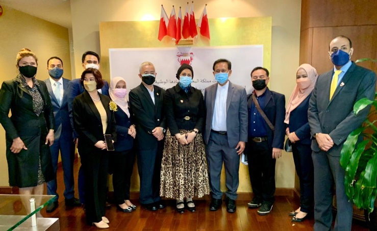 Bangkok, Feb. 14 (BNA): Ambassador of the Kingdom of Bahrain to the Kingdom of Thailand, Mona Abbas Mahmood Radhi, held a meeting at the embassy today with Chairperson of the E-Commerce Committee at the Ministry of Agriculture and Cooperatives, Krittha Bhokharasthit, the former Ambassador of the Kingdom of Thailand to the Kingdom of Bahrain, Na Songkhla Thanis, the Director of the Halal Science Centre of Chulalongkorn University, Prof. Dr. Dahlan Winai, the Assistant Director of the Halal Centre, Dr. Mahamad Pornpimol and Assistant Director of the Halal Centre, Dr. Denyingyhot Anat.