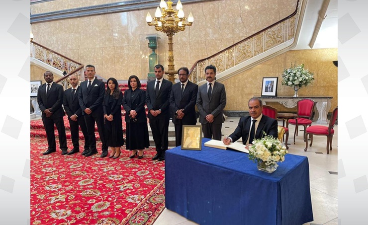 London, Sept. 16 (BNA): The Ambassador of the Kingdom of Bahrain to the United Kingdom, Shaikh Fawaz bin Mohammed Al Khalifa, his wife and members of the diplomatic mission offered condolences at Lancaster House in the United Kingdom on the passing of Her Majesty Queen Elizabeth II, Queen of the United Kingdom of Great Britain and Northern Ireland.
