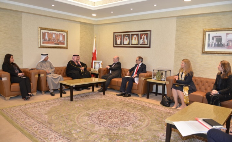 Manama, Feb. 20 (BNA): Justice, Islamic Affairs and Endowments Minister Shaikh Khalid bin Ali Al Khalifa received today British Minister of State for Middle East Affairs Alistair Burt, in the presence of British Ambassador to Bahrain Simon Martin. The Justice, Islamic Affairs and Endowments Minister welcomed Alistair Burt and his accompanying delegation, lauding outstanding historical relations of friendship between both countries and peoples and their growth in all fields. Both sides ways of boosting bilateral cooperation, mainly in the judicial field