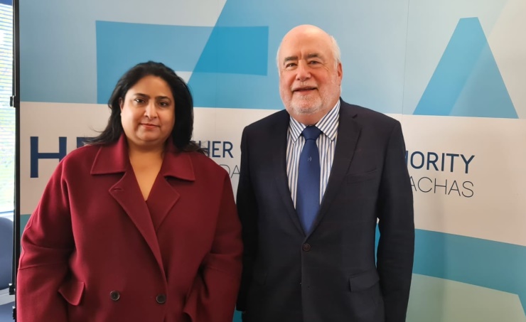 Manama, Oct. 5 (BNA): Secretary-General of the Higher Education Council (HEC), Deputy Chairperson of HEC Board of Trustees, Dr. Shaikha Rana bint Isa bin Duaij Al Khalifa, Higher Education Authority (HEA)'s Board of Directors Chairman, Michael Horgan, and Chief Executive Officer, Dr. Alan Wall.