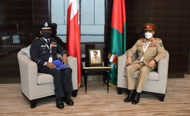 Manama, Nov. 20 (BNA): Chief of Staff of Bahrain Defence Force, Lieutenant General Dhiab bin Saqr Al Nuaimi received at the Four Seasons Hotel today Indian Air Marshal Balabhadra Radha Krishna, the Chief of Integrated Defence Staff and Chairman of the Chiefs of Staff Committee, on the sidelines of the 2021 Manama Dialogue forum. The BDF Chief of Staff welcomed him, lauding relations between the two friendly countries and their perpetual development in various fields. The meeting was attended by Commander of the Royal Bahrain Naval Force (RBNF), Rear Admiral Mohammed Yousef Al Asam.