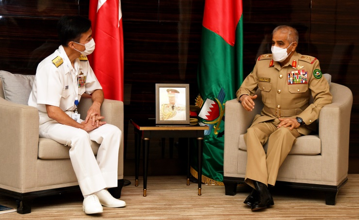 Manama, Nov. 19 (BNA): Chief of Staff of Bahrain Defence Force (BDF), Lieutenant General Dhiab bin Saqr Al Nuaimi received today at the Four Seasons Hotel Japanese Deputy Director General of Defence Plans, Rear Admiral Egawa Hiroshi, on the sidelines of the Manama Dialogue 2021 forum.