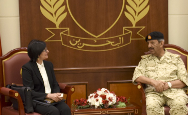 Manama, July 17 (BNA): BDF Commander-in-Chief Field Marshal Shaikh Khalifa bin Ahmed Al Khalifa, received Dr. Basimah Rowe from the military magazine Unipath by the Commander of the United States, accompanied by Colonel David C. WALLIN, US Military Attaché in Bahrain.