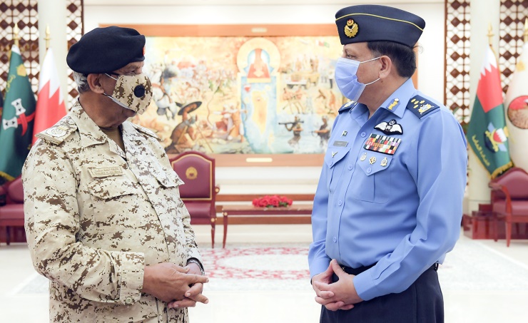 Manama, Feb. 22 (BNA): Commander-in-Chief of Bahrain Defence Force (BDF), Field Marshal Shaikh Khalifa bin Ahmed Al Khalifa, received today Chief of Pakistan Air Force, Air Marshal Zaheer Ahmad Babar Sidu, and his accompanying delegation, in the presence of Defence Minister, Lieutenant General Abdullah bin Hassan Al Nuaimi, and Chief of Staff, Lieutenant General Dhiab bin Saqr Al Nuaimi. The BDF Commander-in-Chief praised deep relations between the Kingdom of Bahrain and the Islamic Republic of Pakistan, stressing the need to further develop them mainly in the military and defence field. The meeting was attended by Defence Ministry Undersecretary Major General Shaikh Ahmed bin Mohammed Al Khalifa, General Command Court Director Major General Hassan Mohammed Sa’ad, Assistant Chief of Staff for Supply and Catering Rear Admiral Yousef Ahmed Malallah, Riffa Air Base Commander Air Vice Marshal Ahmed Ali Al Sadah, Maintenance and Technical Supply Director Rear Admiral Anwar Abdullah Al Jowder, the Royal Bahrain Naval Force Commander Rear Admiral Mohammed Yousef Al Asam, Military Cooperation Director Air Vice Marshal Shaikh Mohammed bin Salman Al Khalifa and BDF senior officers.