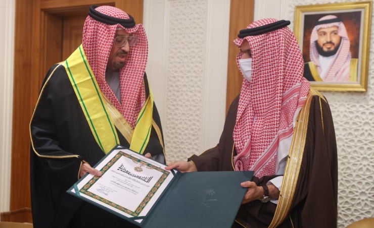 Following orders from Custodian of the Two Holy Mosques King Salman bin Abdulaziz Al Saud the minister conferred on Shaikh Humood bin Abdulla Al Khalifa a Sash of the Second Class for his efforts in to bolster joint ties, wishing him success in his future duties.