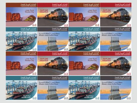 The stamps showcase four major projects of the UAE: Etihad Rail, Masdar City, Shams 1 Solar Power Plant and Khalifa Port.