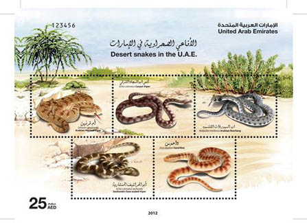 Abu Dhabi, Nov 5, 2012 (WAM) - Emirates Post, in association with Dubai Municipality's Public Parks '&' Horticulture Department, Zoo Management, has issued special stamps on Desert Snakes of the UAE, in 5 denominations of Dh 1, 150 Fils, Dh 3, Dh 4 and 550 Fils, along with a souvenir sheet of Dh 25.
