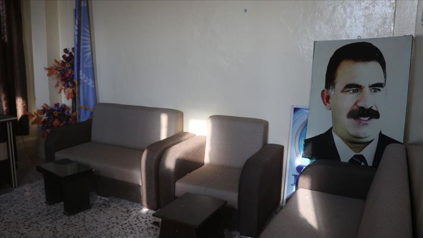 Photographs available with Anadolu Agency from Oct. 20 show the terrorists hanged a banner with a picture of Ocalan at the site of a hospital they destroyed in northern Syria.