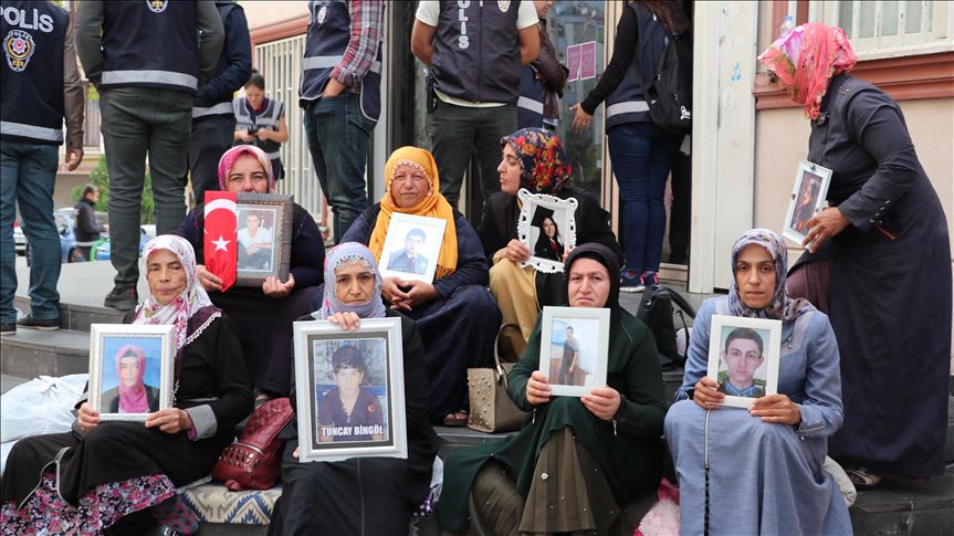 Families’ sit-in protest in front of a political party office in southeastern Turkey continues as they hope to reunite with their children kidnapped by the YPG/PKK terror group. The protest outside the Peoples' Democratic Party (HDP) office in Diyarbakir entered its 50th day on Tuesday, with many families joining forces against the PKK terrorists since Sept. 3. Aysegul Bicer, the mother of Muhammed who was allegedly kidnapped to be recruited by the YPG/PKK, told Anadolu Agency that she would not leave the protest until her son returned home. “We do not bow down to the threats, we are not afraid of them,” she said. “We have started this protest to demand our children’s return, and we will continue till the end,” Bicer added. Expressing families’ pain as they worry for their children, Bicer said the protest would not end until the return of their children. Husniye Kaya, who joined the protest for her daughter Mekiye, also shared her grief over five-year-long longing for daughter, who was 14 year-old when she was kidnapped. “They do not have any mercy. I will not leave here before getting my child back,” Kaya said. On Aug. 22, a Kurdish mother Hacire Akar staged a protest near the HDP office in Diyarbakir, claiming that her 21-year-old son was taken to the mountains by the YPG/PKK terrorists after being brainwashed by the party members. Her son returned home four days later, giving hope to a number of mothers who suffer the same circumstances. On Sept. 3, another mother, Fevziye Cetinkaya, started a protest saying that her son was forcibly recruited by the YPG/PKK, immediately joined by other mothers. Since then, the number of families in front of the building is growing. The families, who come from different provinces across Turkey, asserted their children either were kidnapped or deceived before going to the nearby mountains to join the terror group.