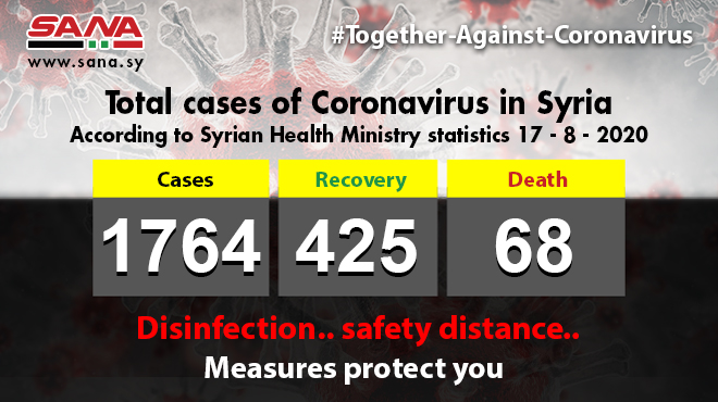 In statement to SANA, the ministry indicated that the infections’ toll registered in Syria have reached to 1764 so far, of which 425 cases have recovered while 68 ones have passed away.