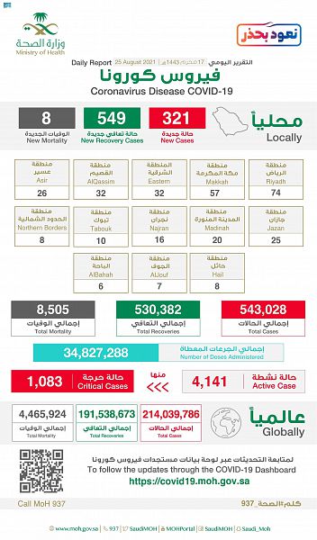 Riyadh, August 25, 2021, SPA -- The Ministry of Health announced today that 321 new confirmed cases of the Novel Coronavirus (COVID-19) have been reported in the Kingdom of Saudi Arabia, bringing the total number to 543,028, including 4,141 active cases. Of these, there are 1,083 critical cases.