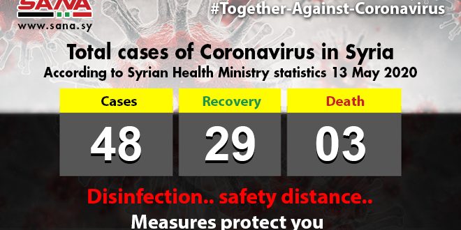 Damascus, SANA- Health Ministry on Wednesday said that a new coronavirus was registered in Syria to raise the total number to 48. With this, the total number of cases registered in Syria reached 48 cases, out of which 29 patients have recovered, while 3 have passed away, the Ministry said in a statement. The first case of coronavirus was registered in Syria on March 22nd for a coming person.