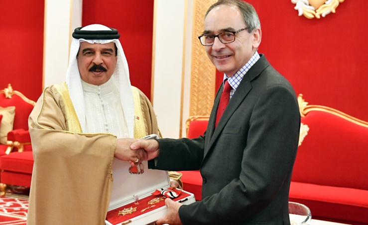 Manama, July 8 (BNA): His Majesty King Hamad bin Isa Al Khalifa today received Ambassador of the United Kingdom to the Kingdom of Bahrain Simon Martin. His Majesty lauded the historic friendship, cooperation and partnership in various fields, and reaffirmed Bahrain's keenness to further consolidate its ties with the United Kingdom to serve the interest and aspirations of the two countries and the welfare of both friendly peoples. HM the King conferred the first-class Order of Bahrain (Wisam Al-Bahrain) to Ambassador Simon Martin in recognition of his tremendous efforts and role in bolstering the fruitful cooperation.