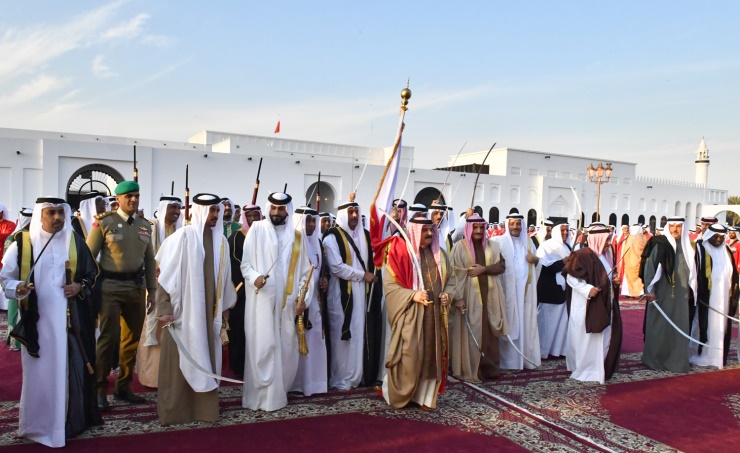 He delivered a speech in which he presented the book which documents almost two decades of landmark strides in the prosperous era, heralding a new phase of national work, achievement, excellence and pride. He said that the book was published, following royal directives, to document achievements in national annals, preserve Bahrain’s memory, preserve the truth, debunk falsification and remain as beacon for the coming generations to build on. HM the King underlined the value of the book, commending the role played by DERASAT in conducting studies and researchers. A Bahraini Ardha show was performed on this national occasion.
